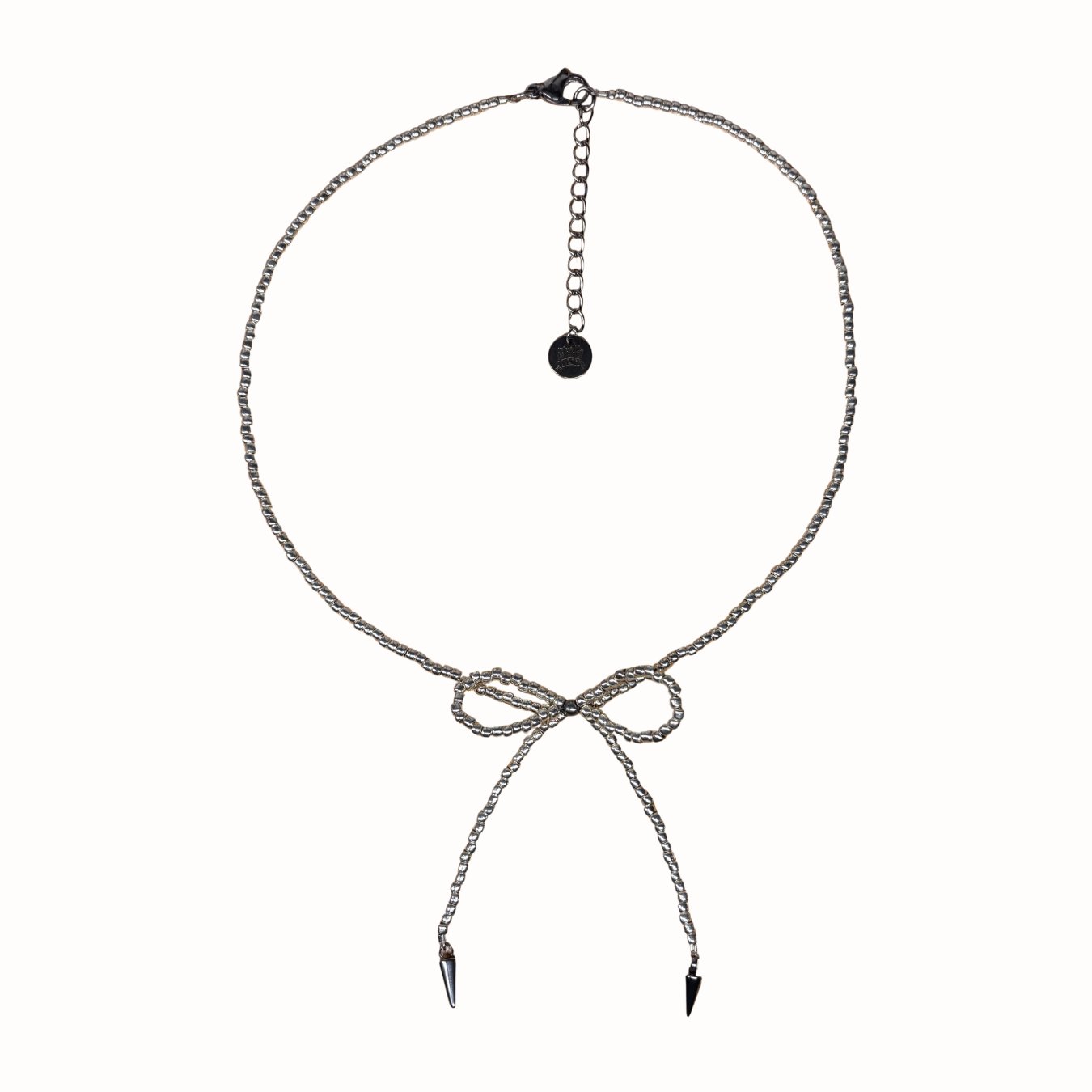 Silver permanent finish seed beads tied in a delicate knot with spikes. All stainless steel hardware. 16" with a 2" extender