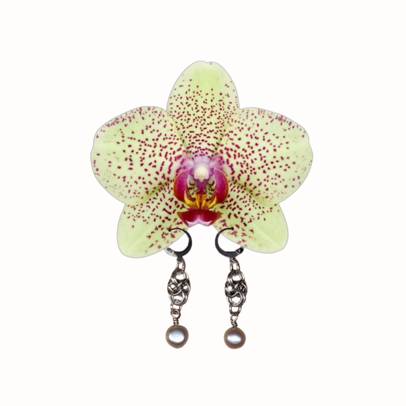 Chainmail with wire-wrapped pink pearl drops. All stainless steel hardware.