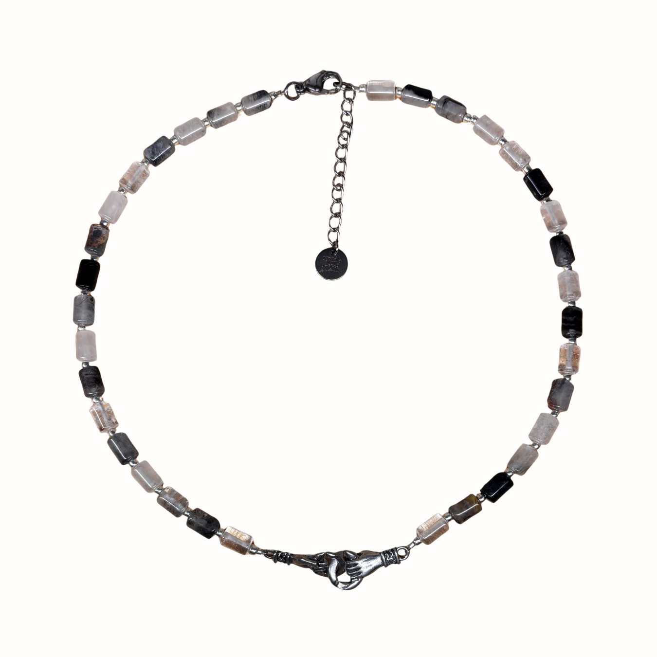 Quartz beads with black and brown inclusions. Vintage brass charm with hands holding interlocking rings. All stainless steel hardware. 16" with a 2" extender
