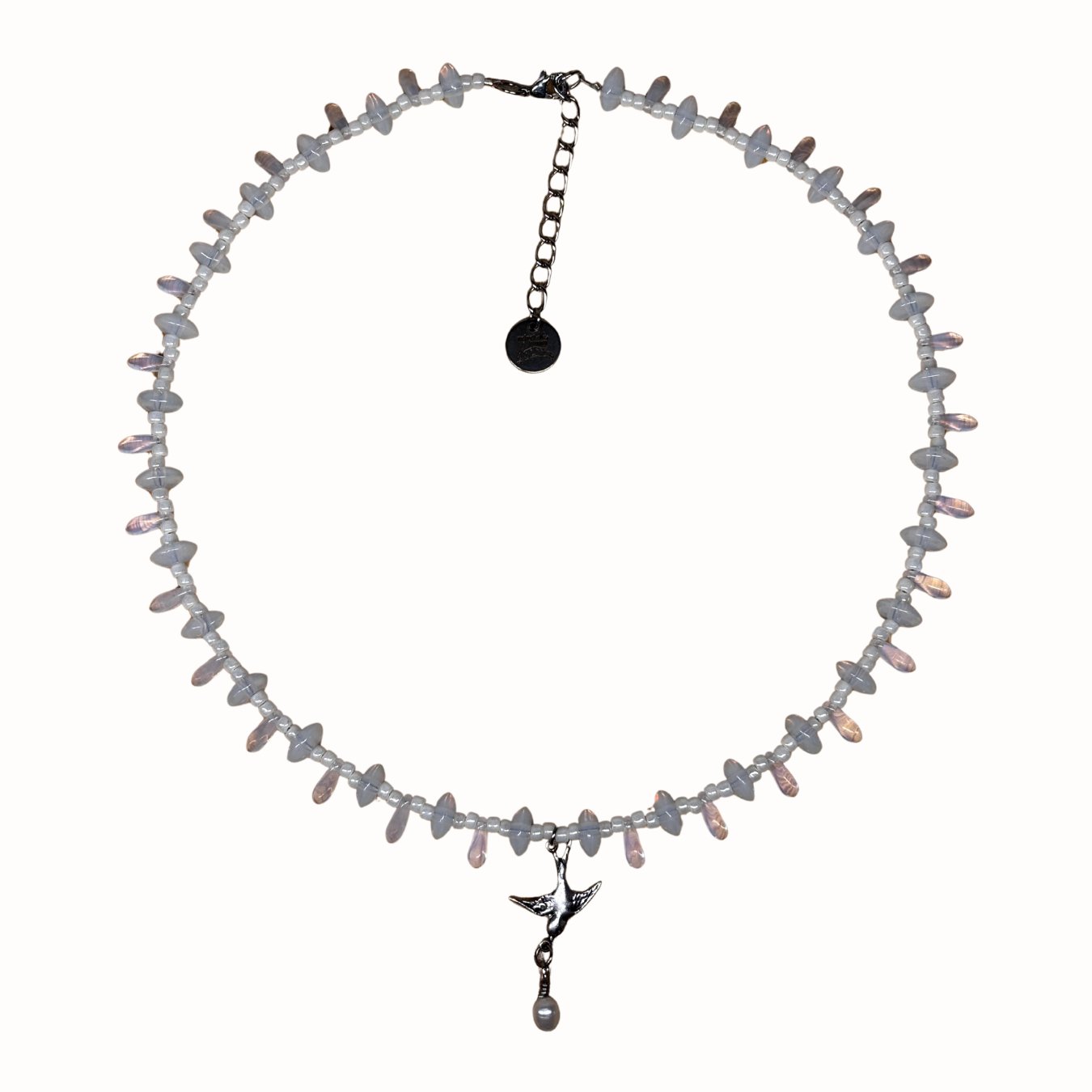 Glass and opalite beads with a vintage bird charm carrying a freshwater pearl. All stainless steel hardware. 16" with a 2" extender